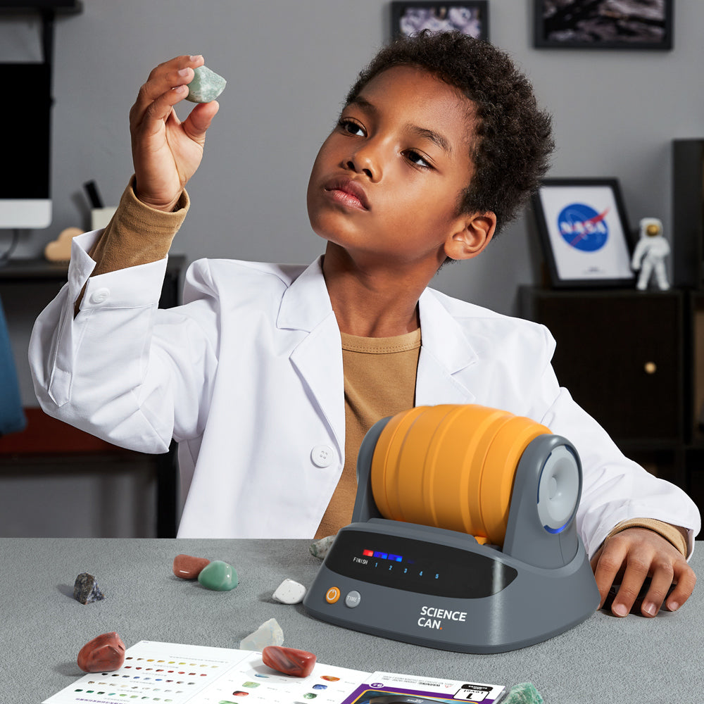 这款石头打磨套装是一款充满趣味和教育意义的儿童STEM玩具,非常适合全家一起玩!您的孩子将享受收集和抛光宝石的乐趣,同时学习宝石的制作方法。套装包含9颗宝石原石、一袋完整的宝石原石和抛光砂砾、一个降噪罩、一个储物袋等等!